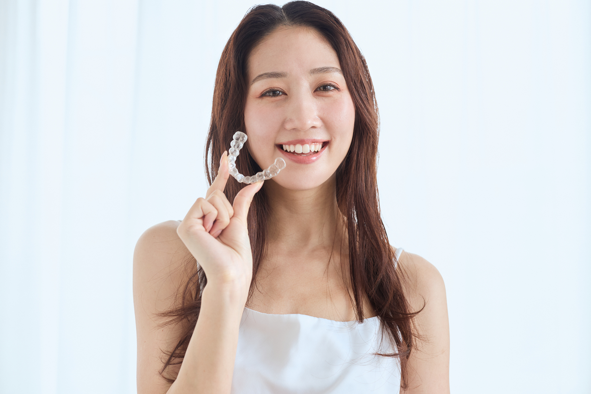 マウスピース矯正を持つ女性